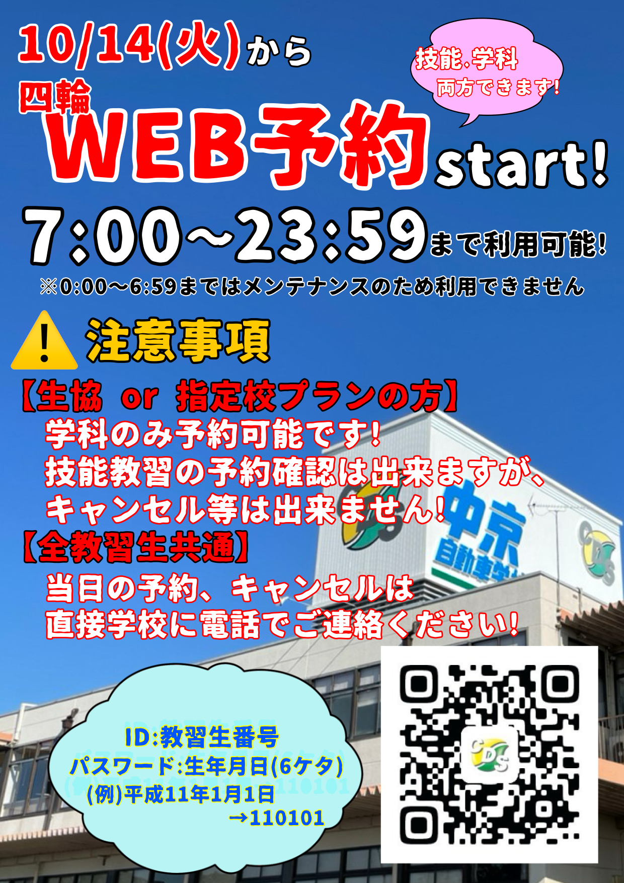 教習をご希望の方は、AM9:30(日曜日はAM8:30)以降に電話にてご予約できます。