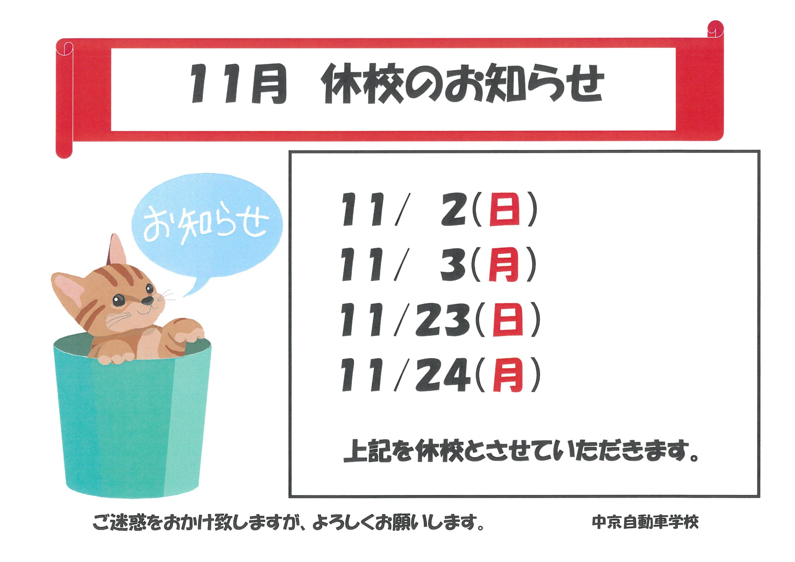 令和7年11月休校のお知らせ